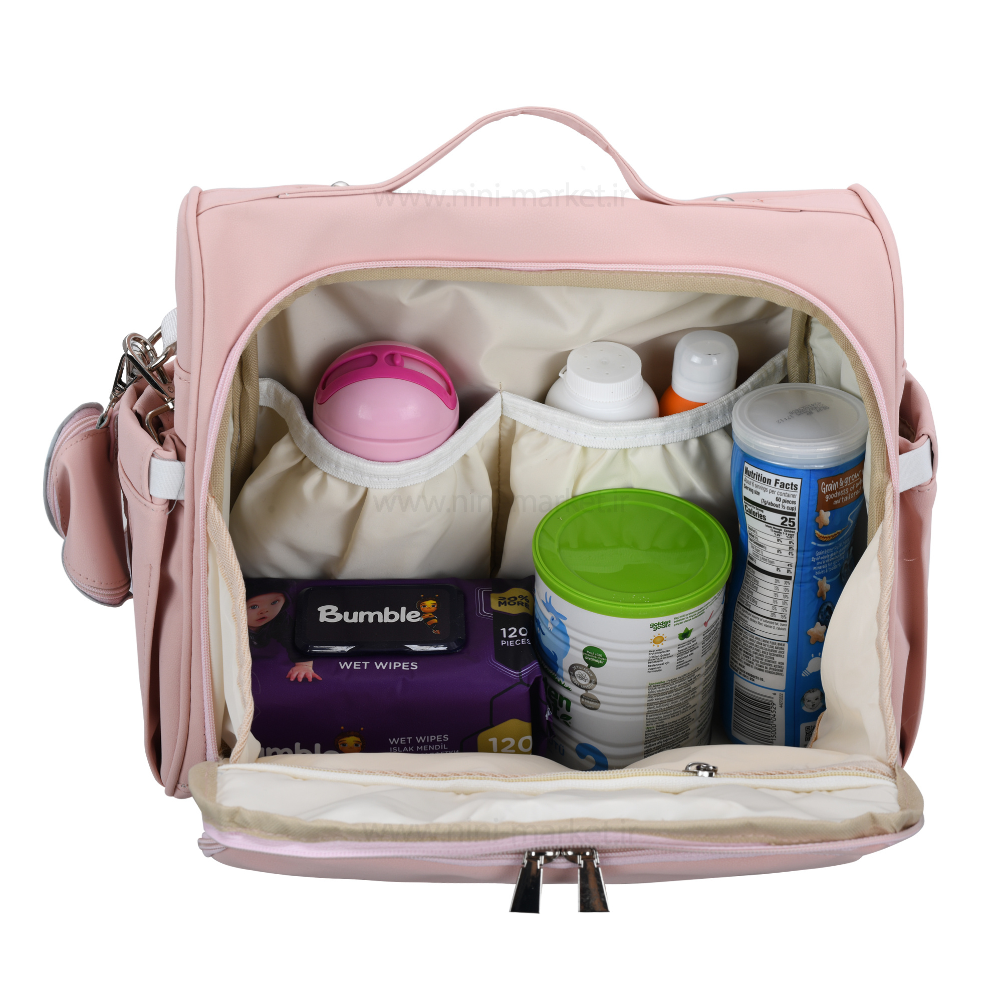 ساک لوازم کوله ای مدل اسپیشال خاویاری رنگ صورتی QZ با امکان استفاده به هر سه حالت دستی، رودوشی و کولهای را دارد. جیب اصلی این کولهپشتی لوازم نوزاد طرحدار از قسمت جلوباز میشود و دسترسی خوبی به وسایل داخلی به شما میدهد. شما میتوانید کیف بچه را به حالت چمدانی قرار داده و وسایل آن را مدیریت کنید. برای استفاده بهصورت کولهای، بندهای کولهپشتی در جیب قسمت پشتی قرار دارند. این بندها ظاهری زیبا و شکیل به کار داده و نیازی به همراه بردن این بندها بهصورت مجزا ندارید. قسمت داخلی ساک لوازم نوزاد دارای آستر ضد آب است و برای آسانی در جادادن لباسهای نمدار نوزاد این قابلیت به کار میآید. شستوشو ساک لوازم نوزاد هم بهصورت دستی و هم در ماشین لباسشویی امکانپذیر است. این کوله نوزادی دارای محفظه گرم نگهدارنده شیشه شیر، جیب مخصوص دستمال مرطوب، جیب مخصوص فلاسک، بند رودوشی و زیرانداز تعویض پوشک به ابعاد حدودی ۳۵*۴۵ است.همچنین برای راحتی در هنگام بیرون رفتن با کالسکه، بند آویز کالسکه در میان وسایل همراه قرار دارد. در ضمن این ساک لوازم به همراه یک عدد کولهپشتی نوزادی تقدیم شما میشود.