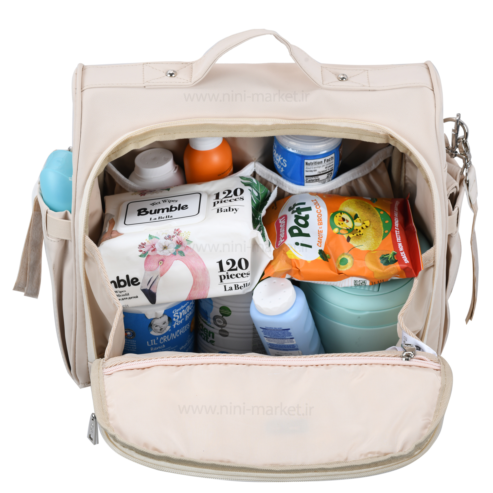ساک لوازم کوله ای مدل اسپیشال خاویاری رنگ کرم QZ باامکان استفاده به هر سه حالت دستی، رودوشی و کولهای را دارد. جیب اصلی این کولهپشتی لوازم نوزاد طرحدار از قسمت جلوباز میشود و دسترسی خوبی به وسایل داخلی به شما میدهد. شما میتوانید کیف بچه را به حالت چمدانی قرار داده و وسایل آن را مدیریت کنید. برای استفاده بهصورت کولهای، بندهای کولهپشتی در جیب قسمت پشتی قرار دارند. این بندها ظاهری زیبا و شکیل به کار داده و نیازی به همراه بردن این بندها بهصورت مجزا ندارید. قسمت داخلی ساک لوازم نوزاد دارای آستر ضد آب است و برای آسانی در جادادن لباسهای نمدار نوزاد این قابلیت به کار میآید. شستوشو ساک لوازم نوزاد هم بهصورت دستی و هم در ماشین لباسشویی امکانپذیر است. این کوله نوزادی دارای محفظه گرم نگهدارنده شیشه شیر، جیب مخصوص دستمال مرطوب، جیب مخصوص فلاسک، بند رودوشی و زیرانداز تعویض پوشک به ابعاد حدودی ۳۵*۴۵ است.همچنین برای راحتی در هنگام بیرون رفتن با کالسکه، بند آویز کالسکه در میان وسایل همراه قرار دارد. در ضمن این ساک لوازم به همراه یک عدد کولهپشتی نوزادی تقدیم شما میشود.