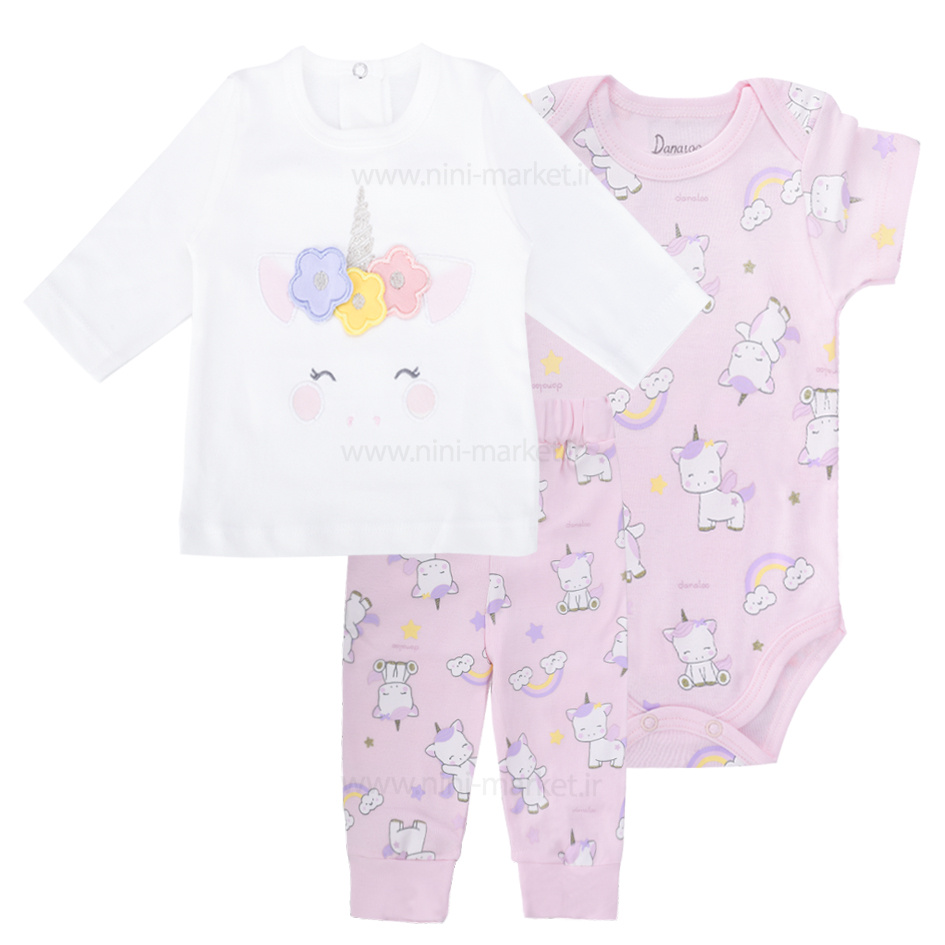 سه تیکه دخترانه طرح تک شاخ رنگ صورتی دانالو