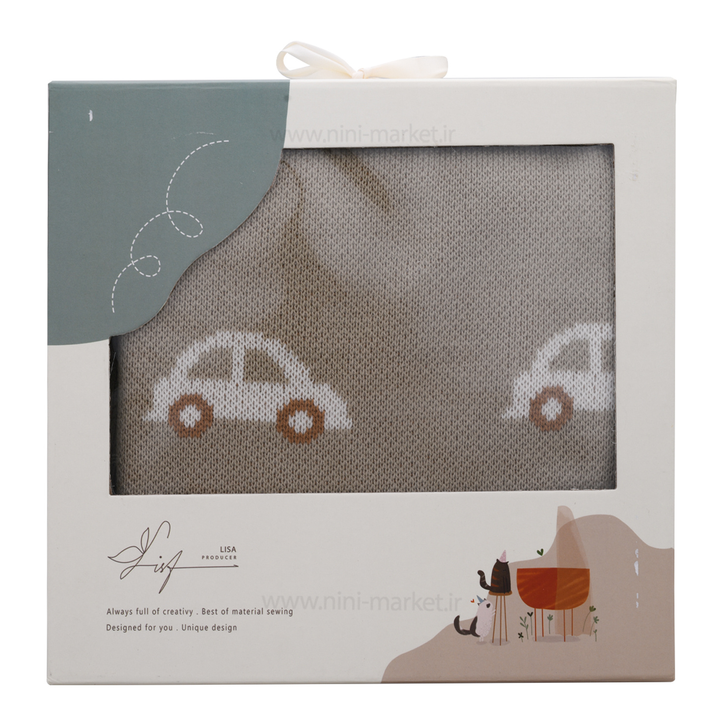 پتو بافت کلاه دار طرح ماشین رنگ کرم لیزا lisa