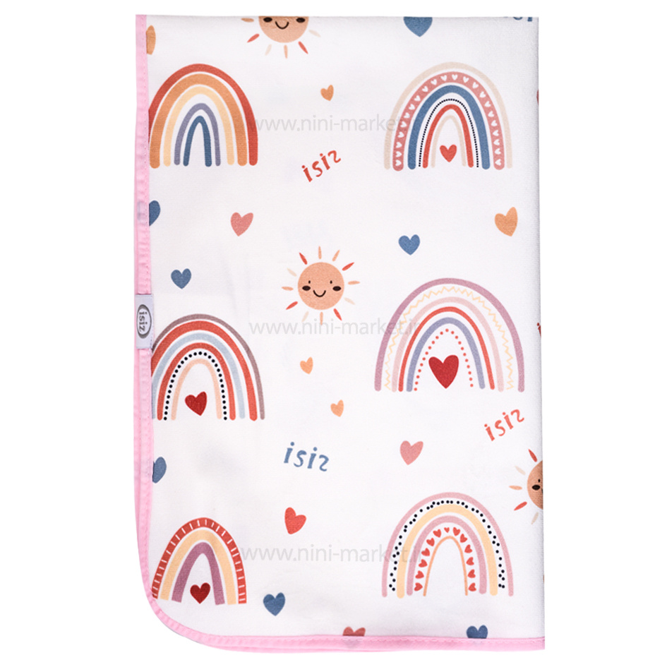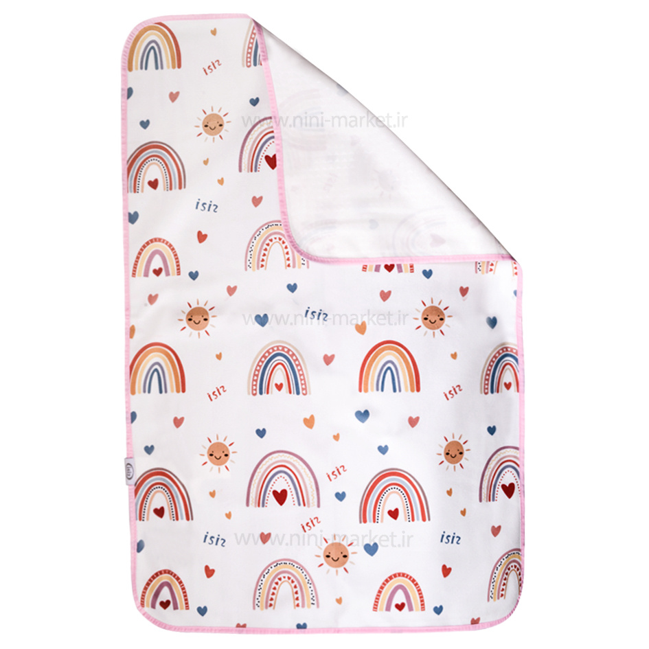 زیرانداز تعویض طرح رنگین کمان رنگ صورتی ایسیز  جنس رویه از پارچه نرم و لطیف می‌باشد و لایه زیرین از جنس مشمایی و ضد نم می‌باشد. این زیرانداز مناسب برای تعویض نوزاد یا زمان‌هایی که پوشک ندارد. زیرانداز تعویض قابل شستشو با دست می‌باشد و در طرح‌های زیبا و جذاب کارتونی و حیوانات تولید شده است همچنین دارای دوختی زیبا و مرتبی دارد و استفاده از آن ساده می‌باشد و به‌راحتی داخل کیف مادر قرار می‌گیرد.