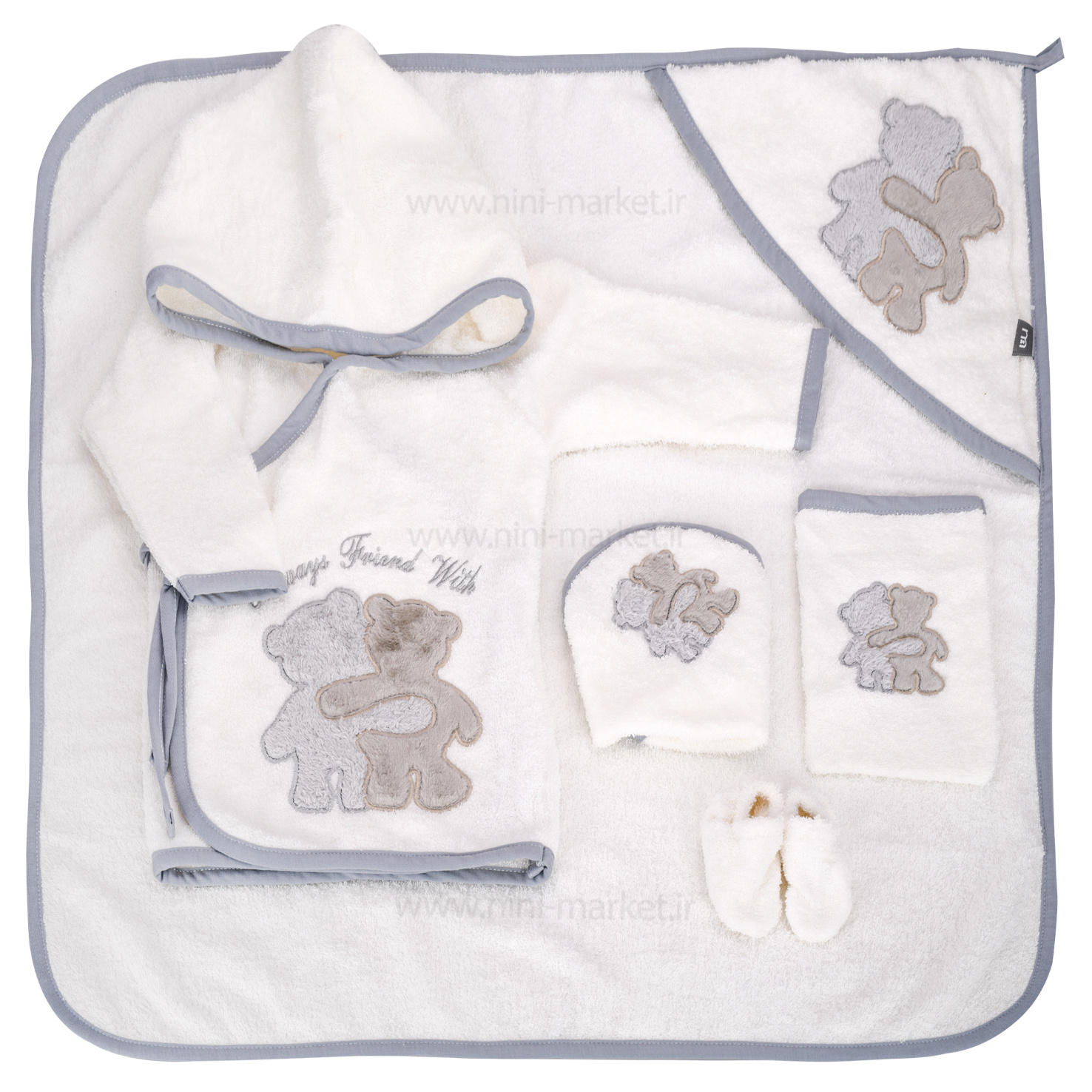 سرویس حوله 5 تیکه طرح دو خرس رنگ سفید طوسی مادر کر