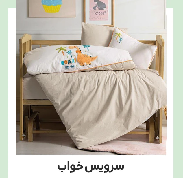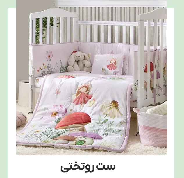 سرویس خواب و ست روتختی: شامل ملحفه، کاور و روتختی مناسب است و محیط خواب نوزاد را تمیز و ایمن می‌کند. رنگ‌ها و جنس مناسب سرویس خواب، حس آرامش و راحتی برای کودک ایجاد می‌کند.