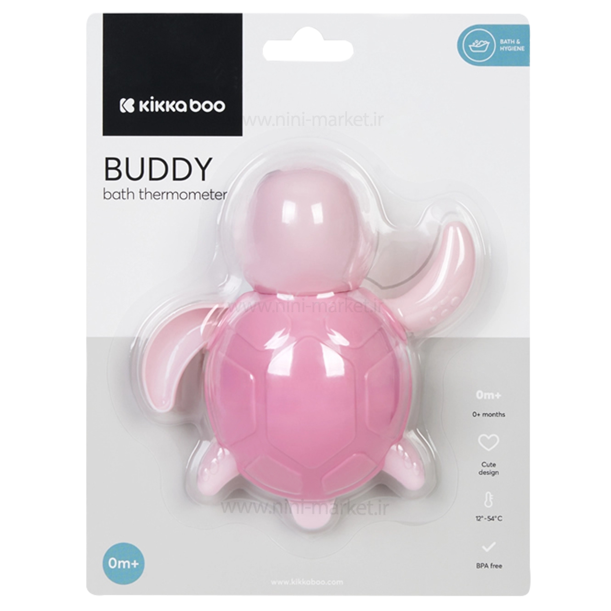 دماسنج حمام طرح لاک پشت کیکابو Kikka boo یک اسباب بازی و یک دماسنج مناسب برای اندازه گیری آب داخل حمام است. این دماسنج یک اسباببازی جذاب با شکلی بامزه برای سرگرمکردن نوزاد در حمام است.دست و پاهای لاکپشت در آب حرکت میکند و لاکپشت روی آب شنا میکند. دمای آب را از ۱۲ تا ۲۵ درجه سانتیگراد نشان میدهد و به شما کمک میکند تا دمای مناسبی را برای استحمام کودک ایجاد کنید. در ساخت این محصول از هیچ مادهٔ مضر و سمی مانند بیسفنول آ BPA است. بهجای جیوه، از نفت سفید تصفیه شده استفاده شده که ایمنی بیشتر و دقت بهتری در ارائهٔ درجهٔ دما دارد. قابلاستفاده از بدو تولد نوزاد است. ابعاد لاکپشت ۱۱.۲ در ۱۳.۲ سانتیمتر است. در دورنگ صورتی و سبز موجود است.