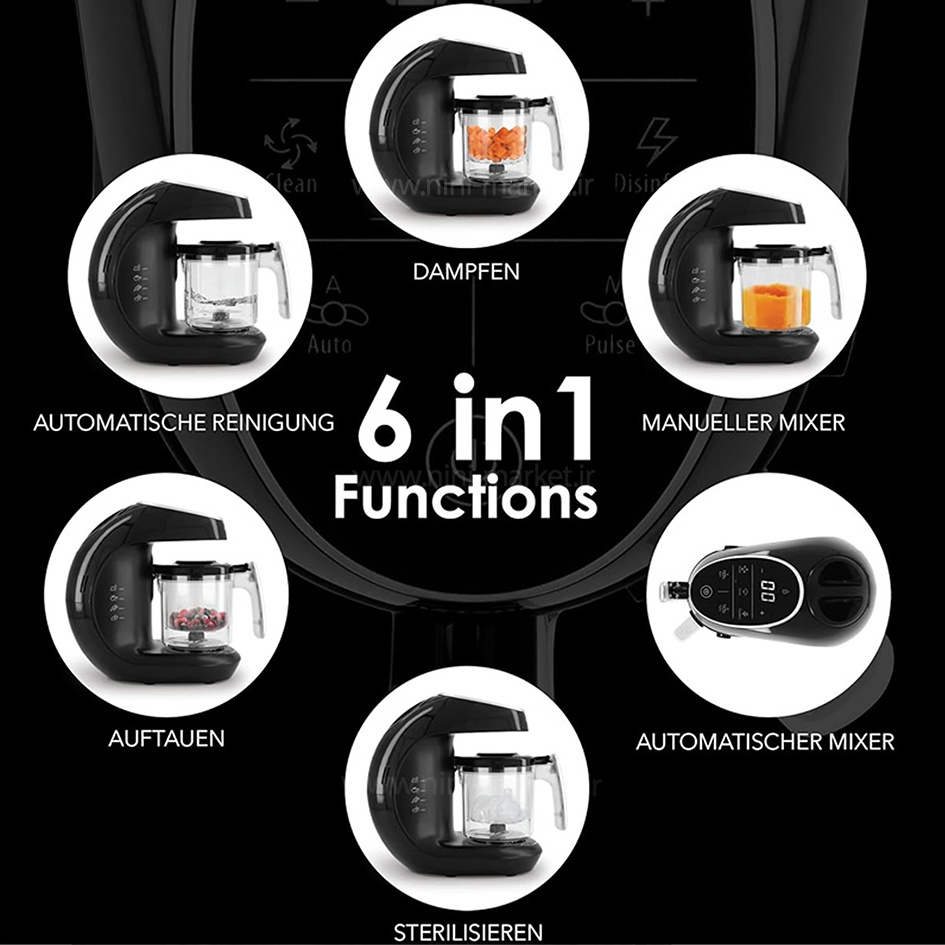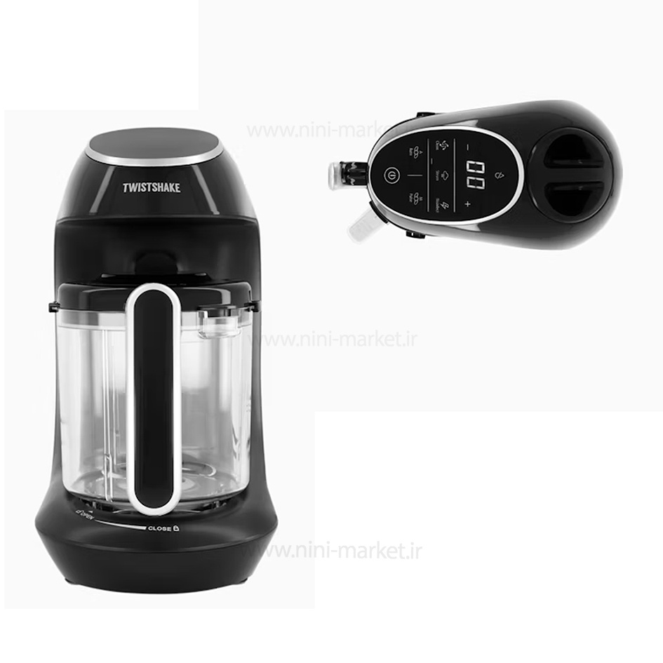 غذاساز کودک ششکاره مشکی تویست شیک Twistshake یک محصول عالی و کامل برای تهیهٔ غذای نوزاد و کودک است.با استفاده از غذاساز پیشرفتهٔ تویست شیک میتوانید بهسادگی آمادهسازی، خردکردن و بخارپز کردن و در نهایت غذایی موردعلاقهٔ دلبندتان را بهسرعت آمادهسازی کنید.غذا ساز جدید تویست شیک دارای یک صفحه لمسی با دکمه های بزرگ و نورانی می باشد که عملکرد دستگاه را آسان می سازد.این محصول دارای یک برنامه تمیزکننده خودکار می باشد که شیشه و تیغه مخلوط کن را با فشار یک دکمه تمیز می کند.این محصول دارای ۶ کارایی مختلف است. بخارپز کردن:با این قابلیت میتوانید انواع سبزیجات، مرغ و گوشت و میوهها را برای نوزاد بخارپز کنید. پوره کردن:با آن میتوانید هر مادهٔ غذایی را بهراحتی خرد و به شکل پوره در بیاورید.یکی از ویژگیهای بسیار قابلتوجه این دستگاه، قابلیت استریل آن است،از دیگر ویژگیهای این محصول این است که شما میتوانید انواع وسایل غذاخوری نوزاد مانند شیشه شیر، پستانک، سرشیشه و … را داخل دستگاه بگذارید تا میکروبزدایی شود. قابلیت مخلوطکن: بهصورت دستی و خودکار را دارد.دستگاه تویست شیک دارای سیستم رسوبزدایی است که یکی دیگر از خصوصیات عالی آن به شمار میآید. شما میتوانید با فشاردادن یک دکمه، کلیهٔ دستگاه را از هر گونه رسوب، پاکسازی کنید. از مزایای دیگر غذاساز کودک می توان به شکل خاص تیغه های فولادی این دستگاه اشاره کرد که در هنگام میکس کردن در مواد غذایی حباب هوا ایجاد نمی شود و این خود عامل موثری در جلوگیری از نفخ و کولیک می شود. و همچنین جداسازی قسمت های مختلف دستگاه براحتی صورت میگیرد و شستشوی آنها بسیار آسان بوده.به همراه دستگاه یک انبر جهت جابجایی مواد غذایی و یک کاردک جهت مخلوط کردن مواد موجود است. درضمن همراه با محصول دو عدد کیسه ۱۰۰ و ۲۲۰ میلی لیتری برای مصرف پوره ارائه میگردد. این کیسهها درپوش دارند و در صورت فشردهشدن توسط کودک پوره از آنها خارج میشود. و درنهایت لازم به ذکر است که کار با این دستگاه مجهز بسیار ساده می باشد و پیچیدگی خاصی ندارد. رنگ مشکی آن مناسب برای ستشدن با هر دکوراسیونی است.