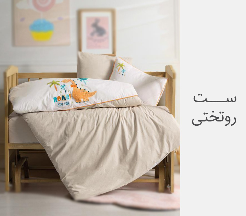 سرویس خواب و ست روتختی: شامل ملحفه، کاور و روتختی مناسب است و محیط خواب نوزاد را تمیز و ایمن می‌کند. رنگ‌ها و جنس مناسب سرویس خواب، حس آرامش و راحتی برای کودک ایجاد می‌کند.